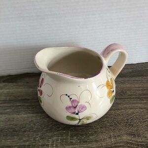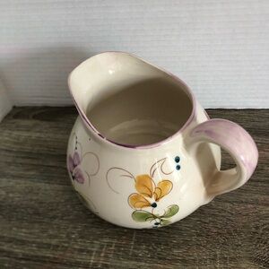 Charming ceramic pitcher with hand-painted floral design. Features pink, yellow, purple, and green accents.
