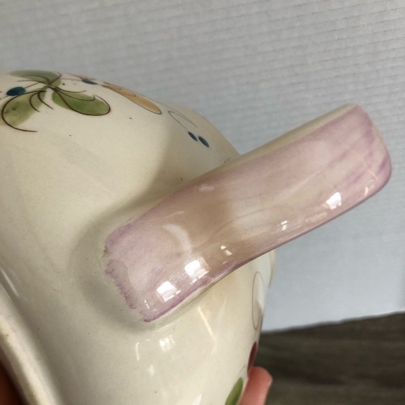 Very good preloved condition- no chips or cracks, some light staining in a couple spots and there is some crazing present. There is a crease line in the joint between the jug and handle and was from the manufacturing process.