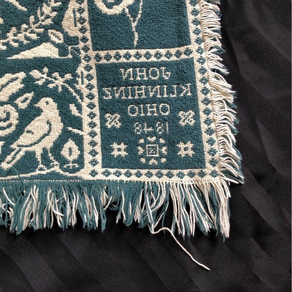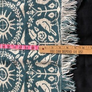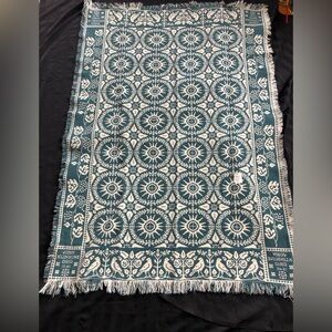 48” x 64”. White and teal with a reverse pattern of the front on the back. Can be displayed white side up or teal side up.
