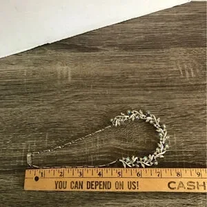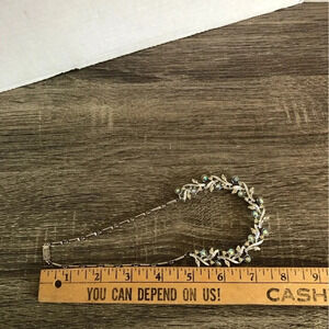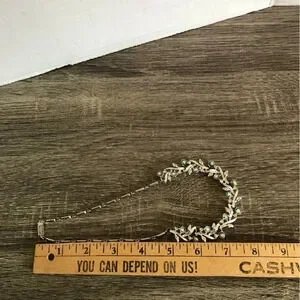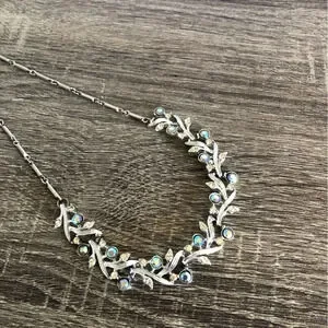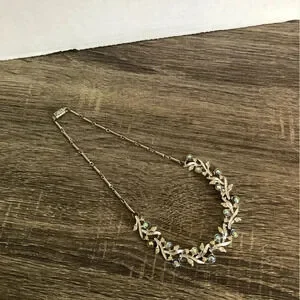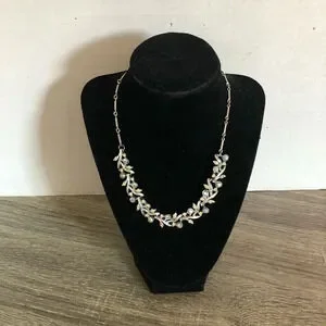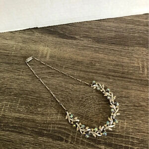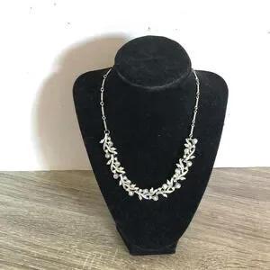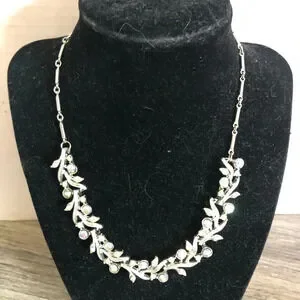 Lovely vintage necklace with a leaf sort of pattern intermixed with rhinestones. Ornate box clasp.