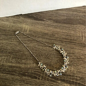 Lovely vintage necklace with a leaf sort of pattern intermixed with rhinestones. Ornate box clasp.