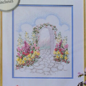DIY kit for ribbon embroidery. Pattern is a garden trellis.