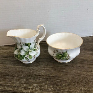 Elegant Royal Albert porcelain sugar bowl and creamer in the Trillium pattern.