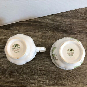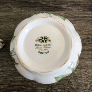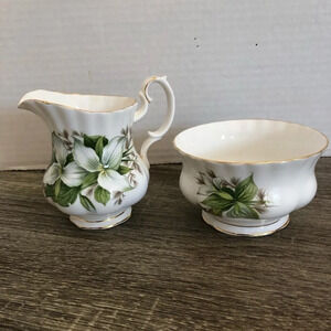 Elegant Royal Albert porcelain sugar bowl and creamer in the Trillium pattern.