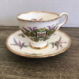 Elegant bone china teacup and saucer set with a charming floral design. Perfect for adding a touch of sophistication to your tea time. This is a limited edition print, a part of the Tartan Series released by Royal Stafford in the 60’s I believe. Made in England.