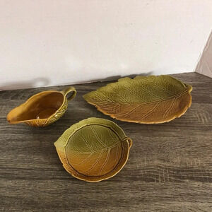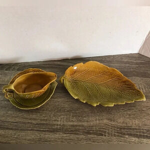 Leaf shaped gravy boat with under plate and matching sandwich platter. Really you could use the gravy boat for cheese sauce and the platter for veggies, it really is up to you.