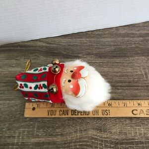 Charming Santa Claus ornament featuring a red and white design with festive bells. Perfect for holiday decor. I believe this has a hand painted face. Each of the decorations on his hat are separate pieces. Lots of time and effort went into this lovely ornament!