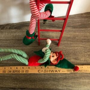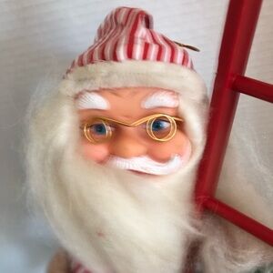 Charming Santa and elf figures climbing a red ladder. Perfect for holiday decoration. Made in Taiwan, likely dates to the 80’s. Bendable arms and legs so you can change the positions or take them off the ladder if you like.