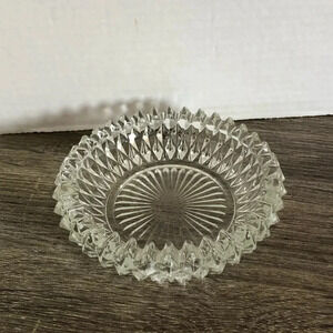 Clear glass in a lovely diamond pattern with a sawtooth edge. Decent weight to the glass but not super heavy like some. Could be used as a candy dish, ashtray, plant pot base, candle holder, or anything else you can think of!