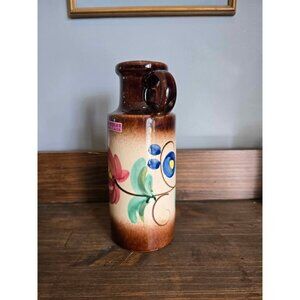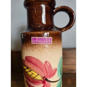 Nice vintage Scheurich vase with original sticker. The handpainted floral pattern harmonises nicely with the warm brown and tan tones. The overall design is a nice mix of traditional folk art with a more modern shape. It's in very good vintage condition. There is crazing in the glaze and a small glaze imperfection on the underside of the handle. 8" tall by 3" wide.