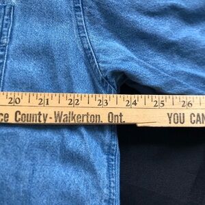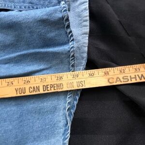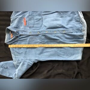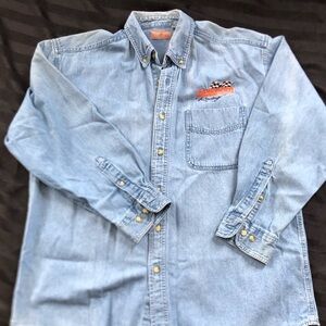 Men’s long sleeve denim button up. Schneider National Racing logo on the chest. Size large. Manufacturing tags are worn so maker unknown.