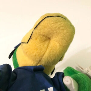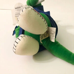 This plush is pre-owned and in used condition. It comes with the tags which are bent and creased. There are stains on his shoes and on the tag as well. Please see all photos for exact item.