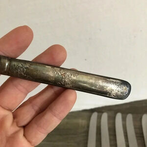 Seven butter/dinner knives. Unknown maker, marked stainless. Floral pattern on the handle. Good pre loved condition, wonderful vintage patina.