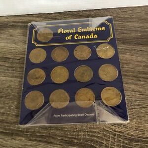 Collectible coin set featuring floral emblems of Canada on one side and the coats of arms of Canada on the other. Includes multiple coins in a cardboard display with plastic wrap.