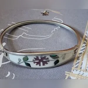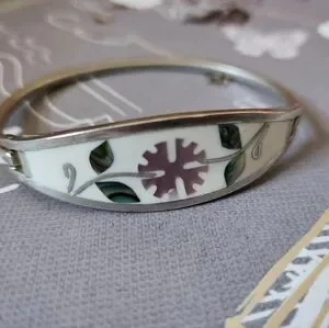 This elegant bangle bracelet features a silver tone finish with a unique inlay shell floral design. very good vintage condition.