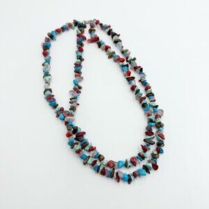The necklace features a beautiful strand of turquoise, tiger eye, amethyst and coral nugget gemstones, Southwestern theme is evident in the ethnic and regional style, as well as the materials used.