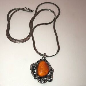 Vtg Sterling Amber Stone Ornate Pendant w Long Chain 23” & 1.5” Pendant
