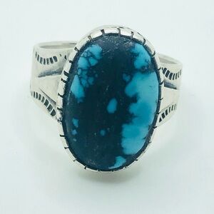 Vintage / antique sterling silver and turquoise Fred Harvey era hand stamped band with large bright oval turquoise stone.