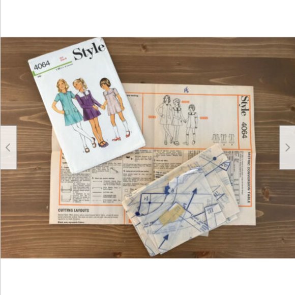Vintage Style #4064 Sewing Pattern in Girl's size 8 (23 1/2" waist/hip 28") is for three different variations of above-knee dress. Choose from short or long sleeves, collar neckline, or bow decoration at neck. This is an original pattern (not a reproduction). Pattern is used, includes all pattern pieces and sewing instructions. Very good vintage condition.