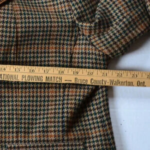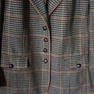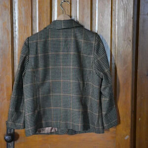 Tan Jay Petites Houndstooth patterned blazer. Made up of brown, beige, dark blue and maybe a tinge of orange.