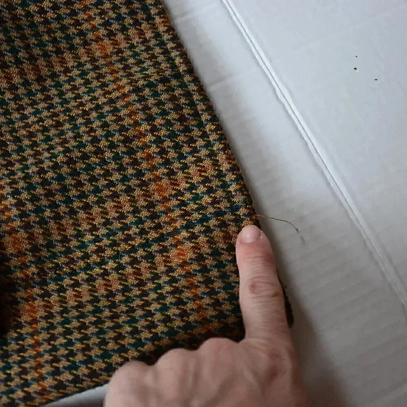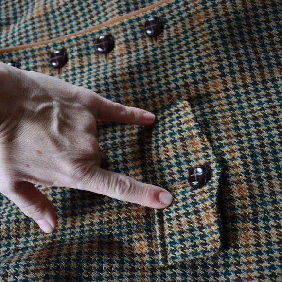 Tan Jay Petites Houndstooth patterned blazer. Made up of brown, beige, dark blue and maybe a tinge of orange.