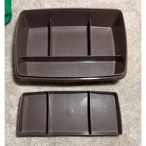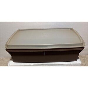 Vintage Tupperware Craft Container from the 1980s, perfect for organizing sewing, beading, or other craft supplies. Features a clear lid to easily view contents and a classic brown Tupperware design.