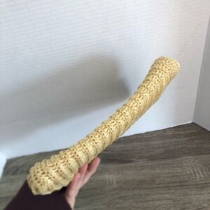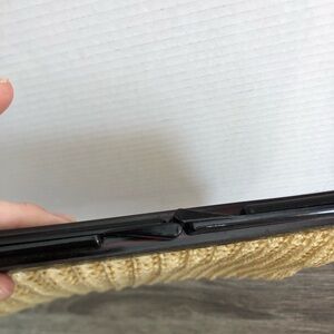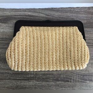 This stylish tan clutch bag is perfect for any occasion. Its elegant design adds a touch of sophistication to your outfit. Woven straw like material with a kiss lock top (possibly lucite or acrylic), lined with cream fabric (card slot pocket inside).