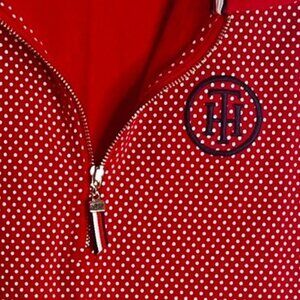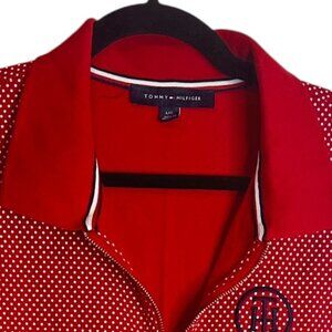 Classic preppy Y2K Tommy Hilfiger style! This sleeveless red polo shirt features white polka dots, a gold zipper collar with Tommy flag pull, and bold Tommy Hilfiger stripes + large TH logo on the chest. A true statement piece for collectors and fans of vintage Tommy.