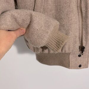 DESCRIPTION: Stay warm and cozy with this vintage wool blend, tweed knit, ribbed cuffs and hem Jacket. Soft Faux Sherpa Lining. Contrasting Hunter green inner collar and zip line accent. Front hand pockets. Hidden Zipper closure with snaps at the neck and base.