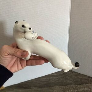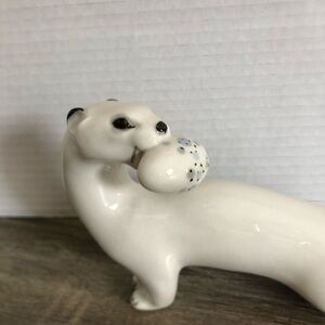 Charming white ceramic weasel egg stealer figurine with baby blue and black accents. Perfect for your nature inspired room or would make a lovely gift for the collector.