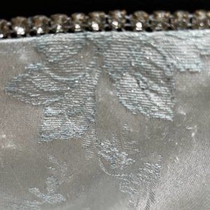 This is a floor-length, strapless princess gown of satiny floral fabric embellished with silver threads to make it sparkle, a rhinestone trim and a sheer shawl. It shimmers and reflects the light, but in a low-key elegant style. The dress is lined and has a tuille bottom "skirt" to give fullness. There are 6 flexible plastic "bones" to give support at the sides, bust, and back. Zips at back and hook-and-eye closure. Label says size 3-4, and the measurements laid flat are: between pits 39.4 cm. (15½ in.), at waist 34 cm. (13½ in.), bottom hem 112 cm. (44 in.); from pit to bottom of hem 117 cm. (46 in.). Shawl measures 178 cm. (70 in.) x 33 cm. (13 in.) Price is low because of some pilling at the edge of the hem (see final photo) - it isn't so obvious as to affect wear, but I want buyer to be aware.