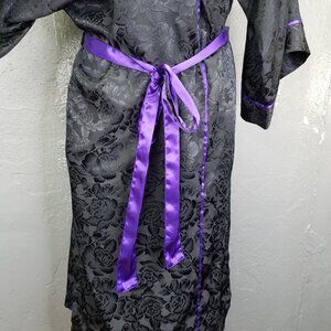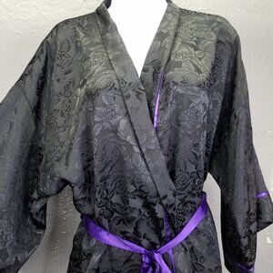 Vtg Victoria Secret Gold Label Robe One Size Satin Rose Black Purple Tie Kimono