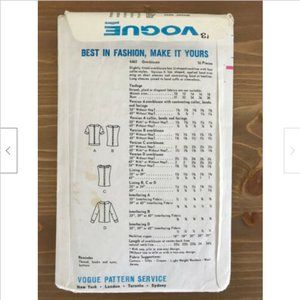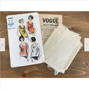Vogue sewing pattern #6465 for 4 styles of ladies blouses. Mix & match collar styles and create dozens of options. Sewing pattern is used, but contains all pattern pieces + instructions. Bust size 36. Pattern description: "Slightly fitted overblouse has u-shaped neckline with four collar styles. Version A has shaped, applied band trimming on short sleeves and contrasting band at hemline. Long sleeves joined to cuffs or sleeveless."