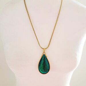 Vtg WHITING & DAVIS Infused Glass Feather Teardrop Pendant Emerald Green Glass
