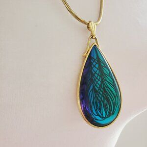 Black feather infused in a large teardrop shaped glass pendant reflecting green, purple, and blue hues