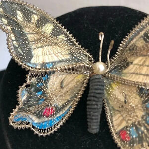 These stunning brooches are a mix between delicate paper wings covered with metal filigree detailing. The metal protects the delicate wings underneath.