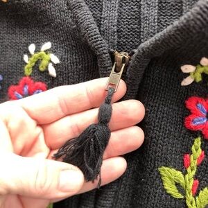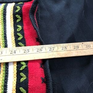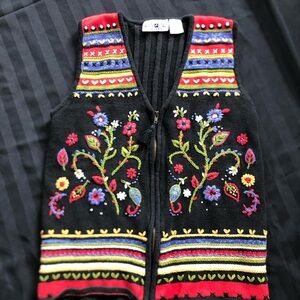 Colourful knit vest with floral patterns. Features vibrant stripes and intricate designs.