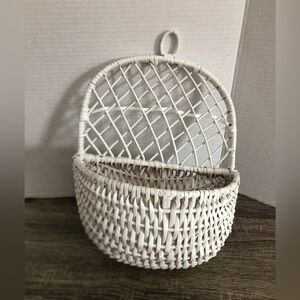 Enhance your home decor with this elegant white woven wall basket. Perfect for adding a touch of style to any room. Nice rounded shape. Would hold a medium flower or could also use for towels in the bathroom.