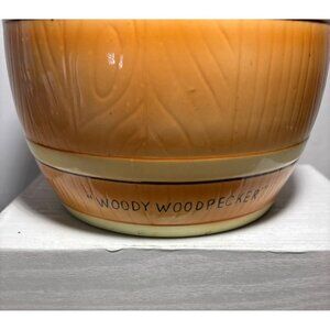 This ceramic cookie jar features Woody Woodpecker atop a barrel design, combining nostalgic charm with practicality for storing treats.