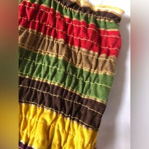 Vibrant dress with multicolor stripes. Features pink, green, yellow, and brown hues.