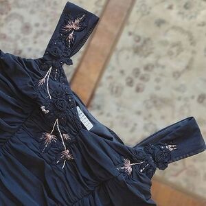 • Dusty rose gold / pink embroidery on black applique, black rosette details and sequins