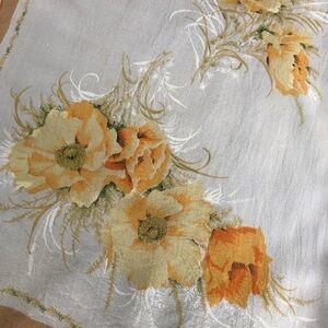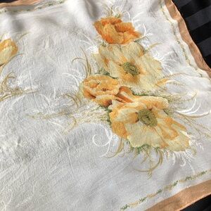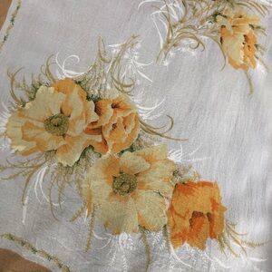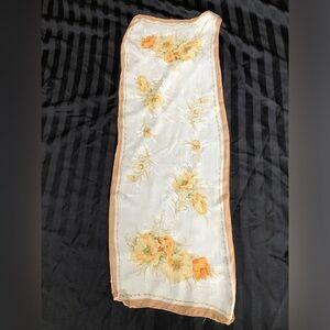 Lovely yellow floral scarf with a white background and white accents. No tags attached so unsure on material content and manufacturer.