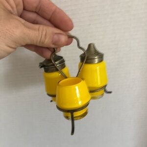 Vtg Yellow Glass Condiment Set in Metal Stand