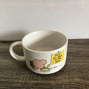 Made in Korea in 1978 for Universal Press Syndicate. Mug pictures Ziggy sitting at a table eating a bowl of soup and the words “soup de jour of the day” is written on a sign in the background.
