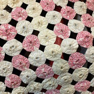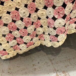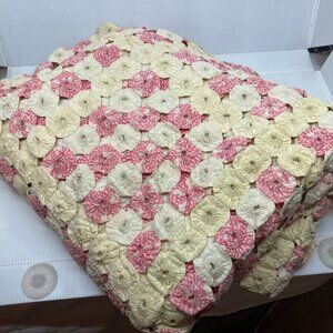 Vtg antique 1930 yo yo yummy hand made quilt 80" x 100" pink/ivory yellow/white