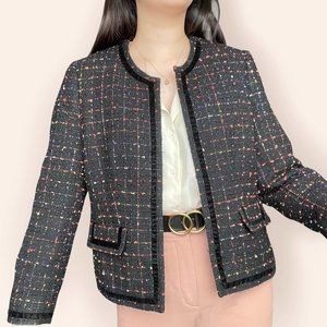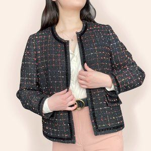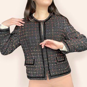 Sparkly black blazer w/ grid of orange and purple thread throughout, black velvet accents, and faux front pockets.