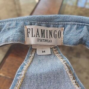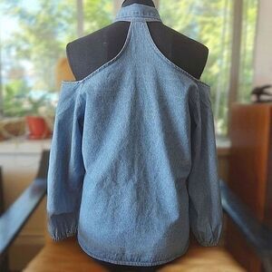 Vtg cold shoulder lace ruffle denim long sleeve button-down shirt