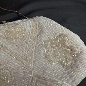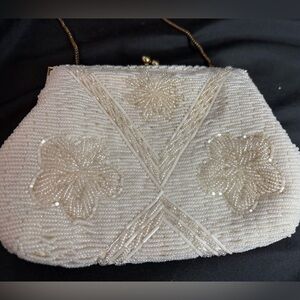 Vtg cream beaded bag. Made in Hong Kong. Measures 7.5” long x 5.5” wide, gold tone chain strap measures 13” long. Perfect for wedding or prom , there are a few long cream beads missing in the lower cross pattern, please see last 2 pictures , this is really unnoticeable ..