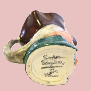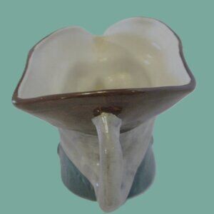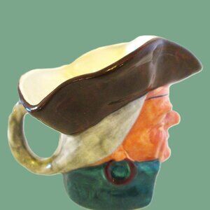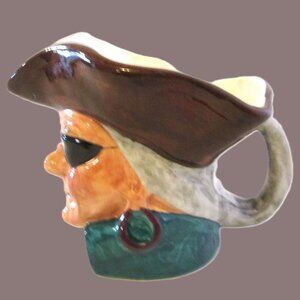 Vintage Toby Captain Patch character creamer jug, Cooper Clayton by Sterling England Circa 1950. Captain Patch was a nefarious pirate who plunders the Caribbean. Early in pirating he lost his eye in a heated sbattle when attacking a Spanish galleon. He wears his patch proudly as a symbol of ruthlessness. The Captain's long bearded ponytail forms a the handle of the jug.