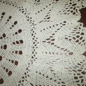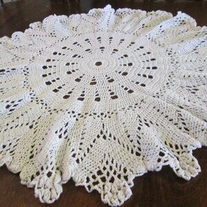 Vintage large round crocheted ecru white cotton table doily 22"(56cm) x 22"(56cm) from tip to tiip. It as the pattern of trees and paws on the outside of doily which give a very pretty effect along with the alight wave in the outer rows of crochet done so attractively. This doily would look very attractive with a pretty vase in the centre as well. This doily is reminiscent of some long ago memories of home where we enjoyed an older generation an their labours so lovingly showered on us as grandchildren. This represents many hours of intricate work. A gorgeous piece.